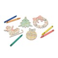 Zestaw świątecznych zawieszek wykonanych z drewna. W zestawie znajdują się 4 różne wzory oraz kredki świecowe, którymi można pokolorować zawieszki.