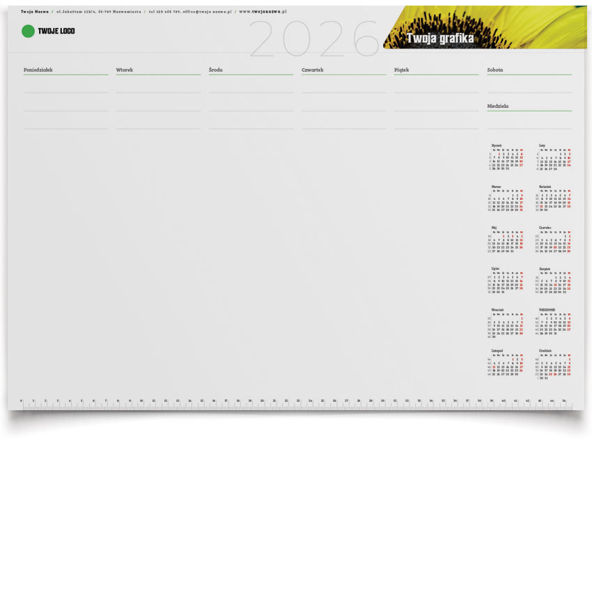 Podkład na biurko, gotowy projekt. Miejsce na zamieszczenie logo, danych teleadresowych oraz grafiki. Podkład wykonany z papieru, na którym bardzo dobrze się pisze. Klejenie górnej lub dolnej krawędzi. Cały blok podklejony jest od spodu sztywnym kartonem.