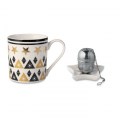 Zestaw świąteczny zawierający ceramiczny kubek, zaparzacz oraz mini talerzyk. Zapakowany w upominkowy kartonik z wieczkiem z PCV, przewiązany ozdobną nitką z etykietą.