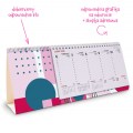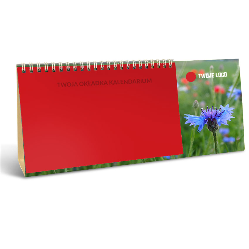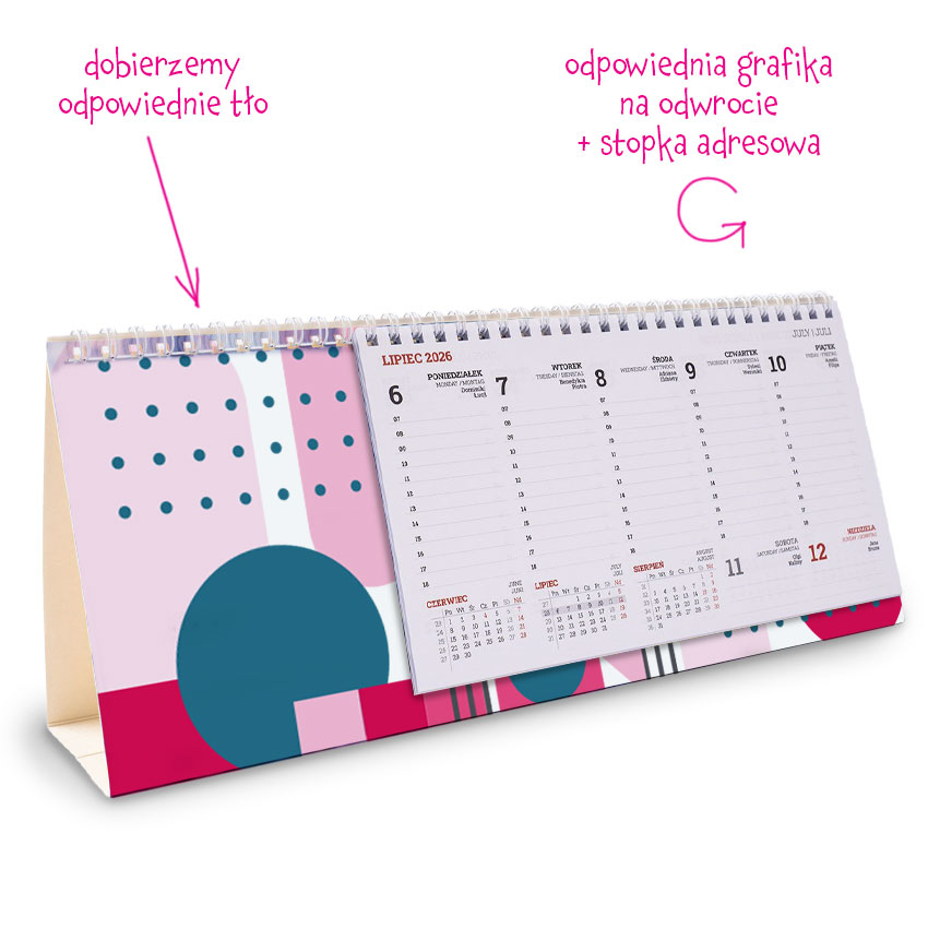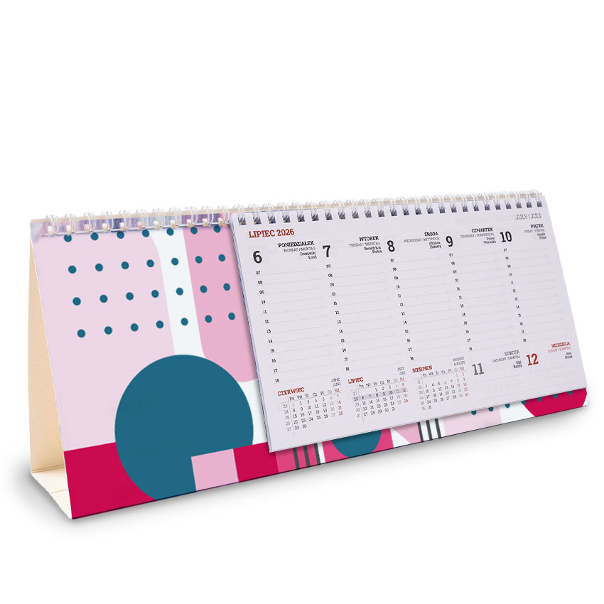 Kalendarz biurkowy, terminarz tygodniowy 315x134mm. Indywidualny projekt podkładu oraz okładki kalendarium. Terminarz posiada tygodniowe kalendarium, dzięki czemu jest w nim dużo miejsaca na notatki. U dołu każdej strony znajduje się dodatkowo minikalendarium obejmujące poprzedni, bieżący i kolejny miesiąc. Kalendarium łączone jest z podstawą za pomocą srebrnej spirali.