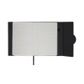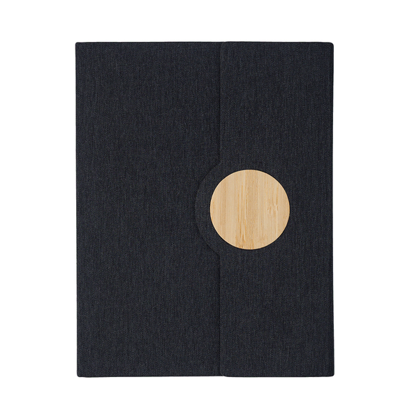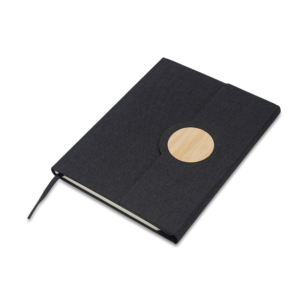 Elegancki notes w linie (80 arkuszy 70g/m2 w twardej oprawie z tkaniny RPET, ozdobiony bambusowym elementem. Posiada uchwyt na długopis. Zamykany na magnetyczne zapięcie.