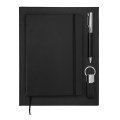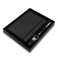 Zestaw składający się z notesu A5, długopisu i breloka. Notes w twardej oprawie, 80 kartek w linie, 70 g/m2. Długopisu wyposażony w niebieski wkład. Brelok do kluczy. Wszystkie elementy w wykończeniu z ekoskóry. Zestaw pakowany w czarne pudełko upominkowe.