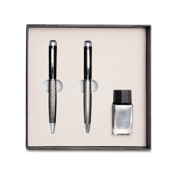 Elegancki zestaw piśmienniczy składający się z metalowego pióra wiecznego, długopisu oraz buteleczki z atramentem. Całość pakowana w pudełko upominkowe.